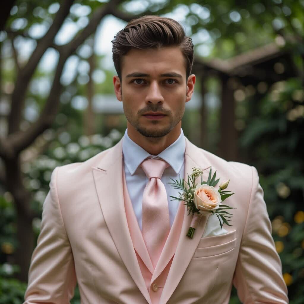 Soft-toned, gentle groom look with pastel suit and floral details.