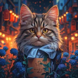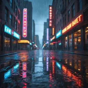 «Rainy street reflections, neon signs»