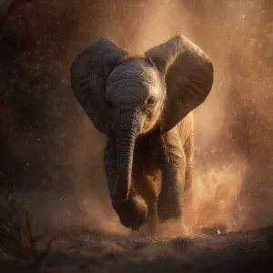 «A baby African elephant named Ember, just born. Gentle particles...»