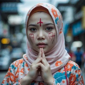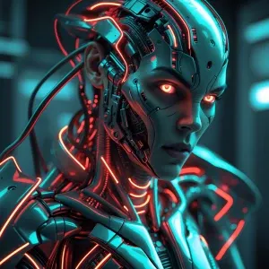 «Create a hauntingly captivating scene featuring a cyborg with tw...»