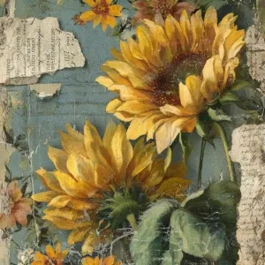 «Vintage sunflower junk journal page, layered shabby papers with...»