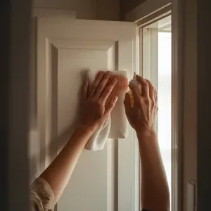 «hands cleaning a single kitchen cabinet door with microfiber clo...»