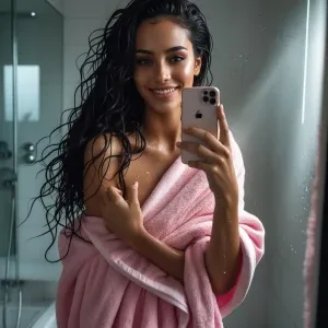 «A stylish young Brazilian influencer taking a mirror selfie in a...»