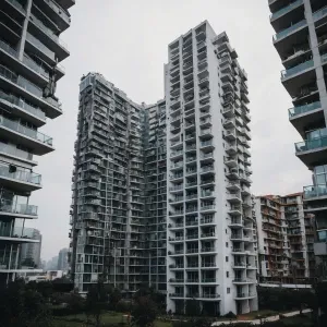 «A big white skyscraper with floor to ceiling windows and balconi...»