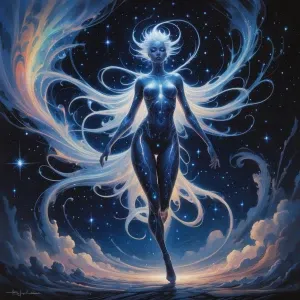 «In the center of the canvas floats an ethereal void voyager, exu...»