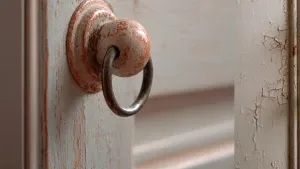 «Photograph a single kitchen cabinet door close-up, showing sligh...»