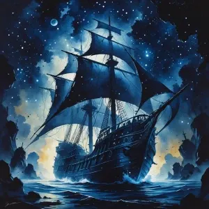 «A shadowy galleon sails through a stygian galaxy, its ancient ti...»