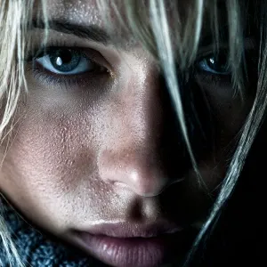 «Ultra close-up noir portrait of a determined blonde woman. Her e...»