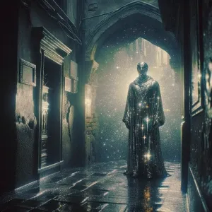 «A glimmering holographic celestial wormhole wrangler stands in a...»