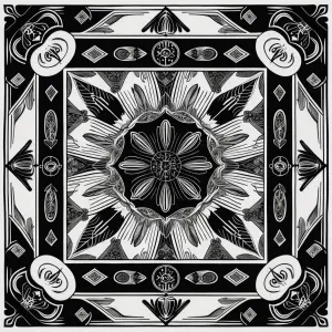 «A black-and-white woodcut-style Vietnamese bandana pattern, feat...»
