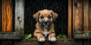 «Puppy in wooden hut during rain»