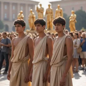 «Three young men, dressed in simple, light beige togas, stand pro...»