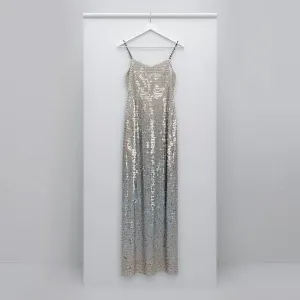 «A dazzling sequin dress hanging elegantly on a sleek, minimalist...»