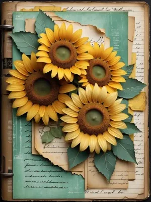 «Sunflower junk journal page, layered vintage paper collage, asse...»