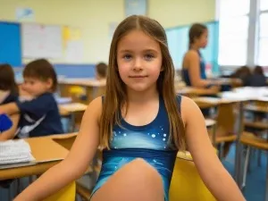 «A teenage girl sitting in front of me viibrant swimsuit, middle...»