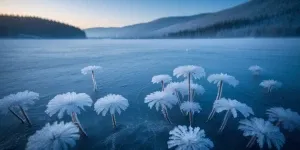 «Frost flowers on a frozen lake that glows faintly blue»
