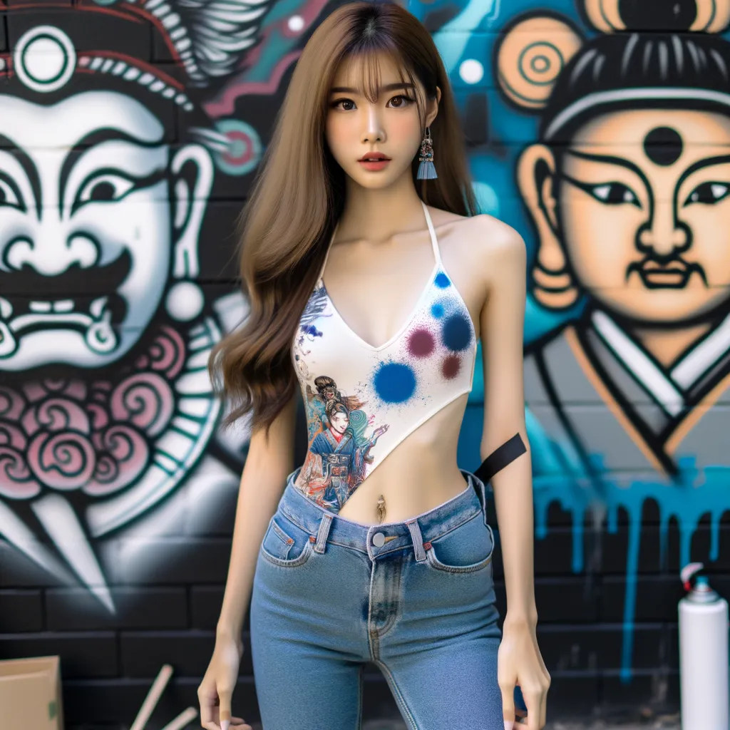 Very thin Athletic Thin skinny Attractive, Asian teenage girl, long brown hair and bangs, wearing tight skinny jeans and a halter top paint marks on her clothing, asian graffiti back round