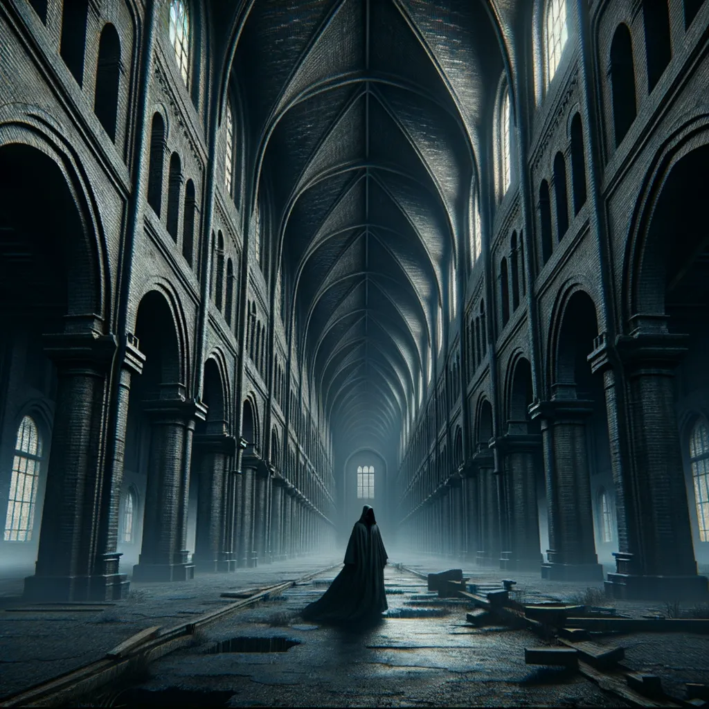 Creates 3D Image with dark, moody aesthetics, incorporating architectural elements from the Gothic era