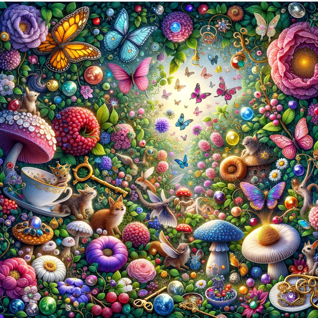 "Create an intricate 'I Spy' garden scene blooming with vibrant flowers and magical creatures. Imagine a lush, overgrown garden where gemstone berries glisten beside iridescent-winged butterflies. A hidden fairy's abode is tucked away beneath a mushroom cap, and a family of tiny dragons plays hide-and-seek among the petals and leaves. Scattered throughout the garden are ten crystal keys, a golden wand entwined with morning glories, three sleeping gnomes wearing pointy hats, and a teacup bird's nest with jeweled eggs. Everything is bathed in the ethereal light of a full moon."