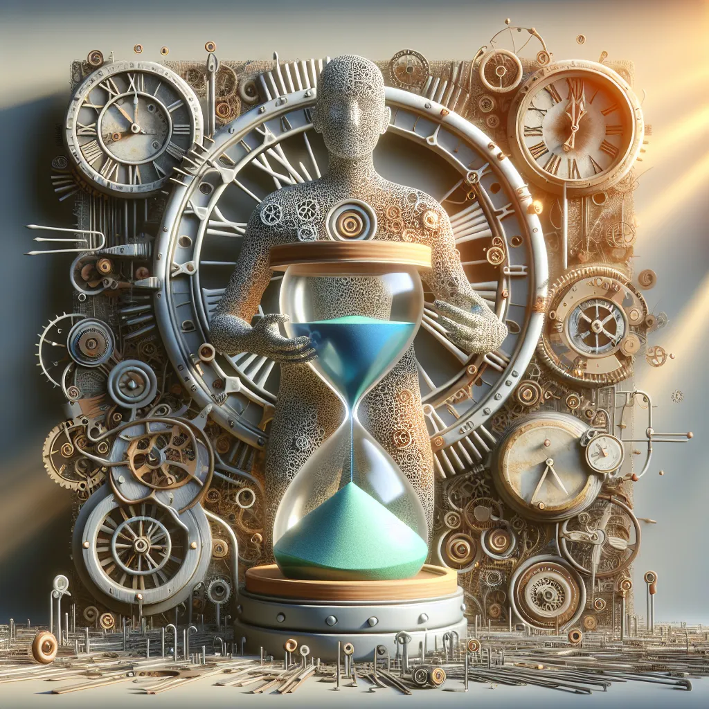 industrial style, in the middle a merged fusion of a humanoid-clockwork holds a sandglass in hands, surrounded with clock faces, with sunlight shines on it, rendered with intricate detail