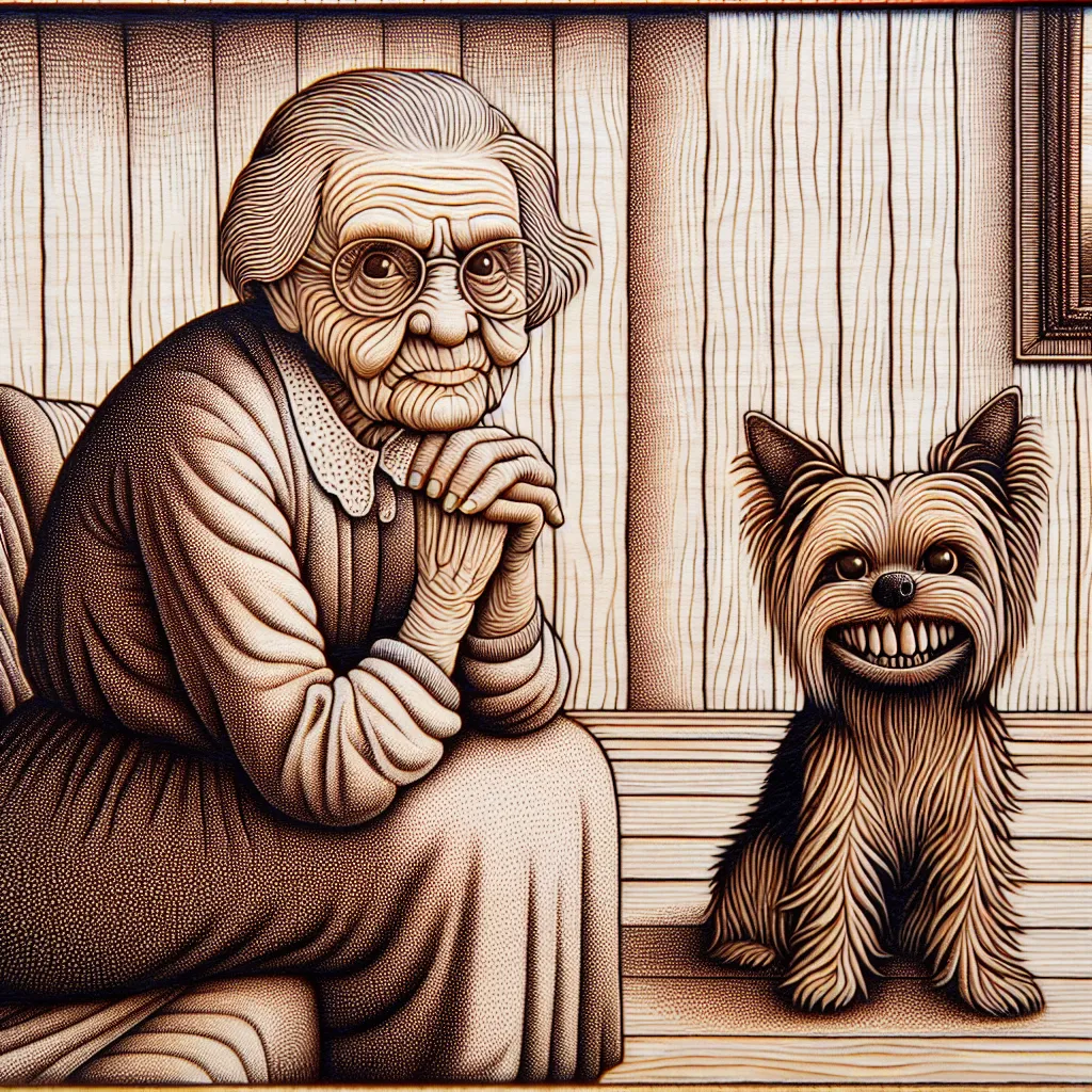 Whimsical old lady with a sullen look sitting in her living room. Her Yorkie by her side grinning with human teeth