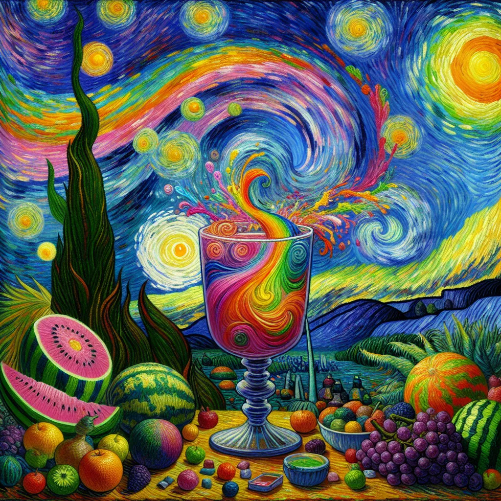 A large drinking glass centered in the middle of the screen, filled with rainbow swirl fluid, sitting on a pedestal in a palm fruit forest with watermelons and purple grapes and rainbows and colorful backgrounds, all supporting happy juice elixir