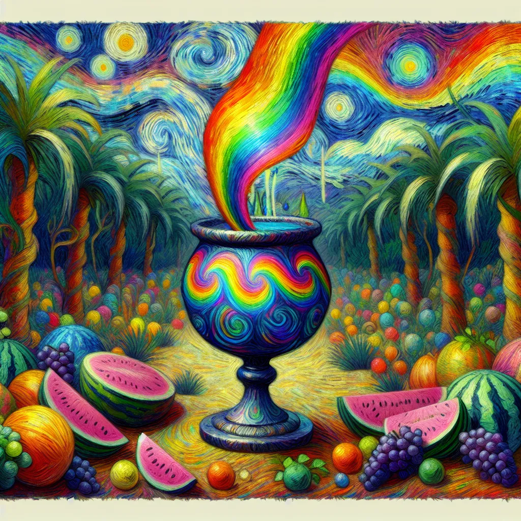A large chalice centered in the middle of the screen, filled with rainbow swirl fluid, sitting on a pedestal in a palm fruit forest with watermelons and purple grapes and rainbows and colorful backgrounds, all supporting happy juice elixir