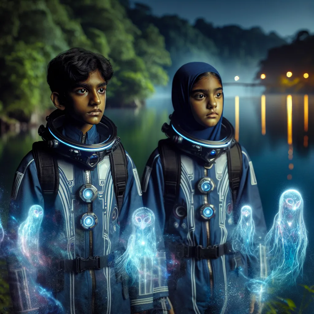 Two girls are standing near the lake at night in a hydro suit and scary spirits are flying around them