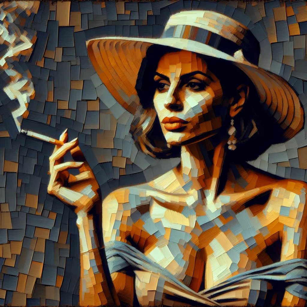 A acrylic paint portrait of a lady smoking a cigarette, the craquelure effect