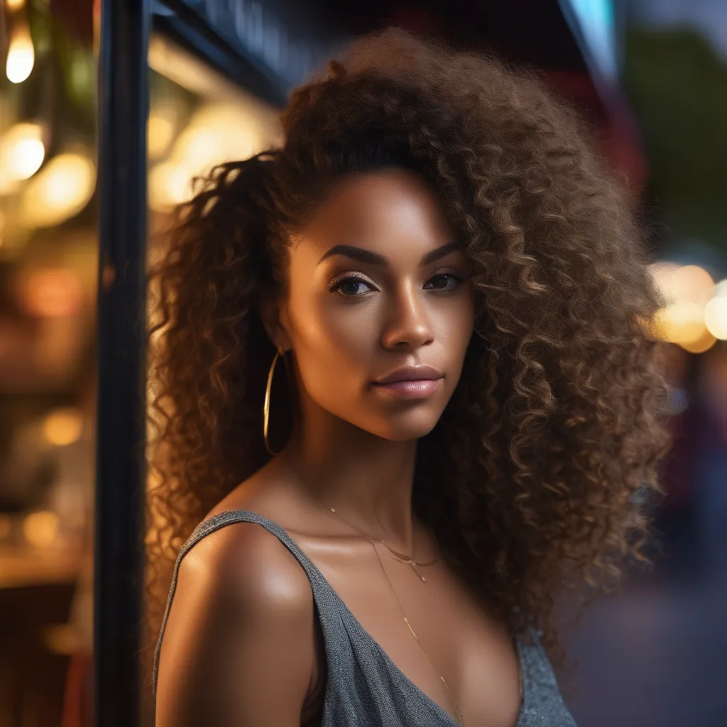 3-D image of a beautiful LIGHT SKIN, African-American woman she has shoulder length curly hair she’s being photographed as she leans against the wall she looks somber she’s standing outside of a beautifully lit restaurant. A colorful picture as if from a nearby projector dances in her face and body. White sand lit by a sky of orangey yellow is the backdrop for this beautiful scene.