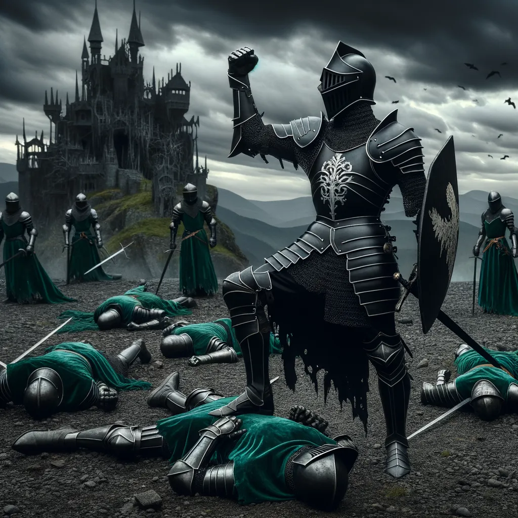 Black knight in victory pose with defeated green knights on the ground in front of a undead castle