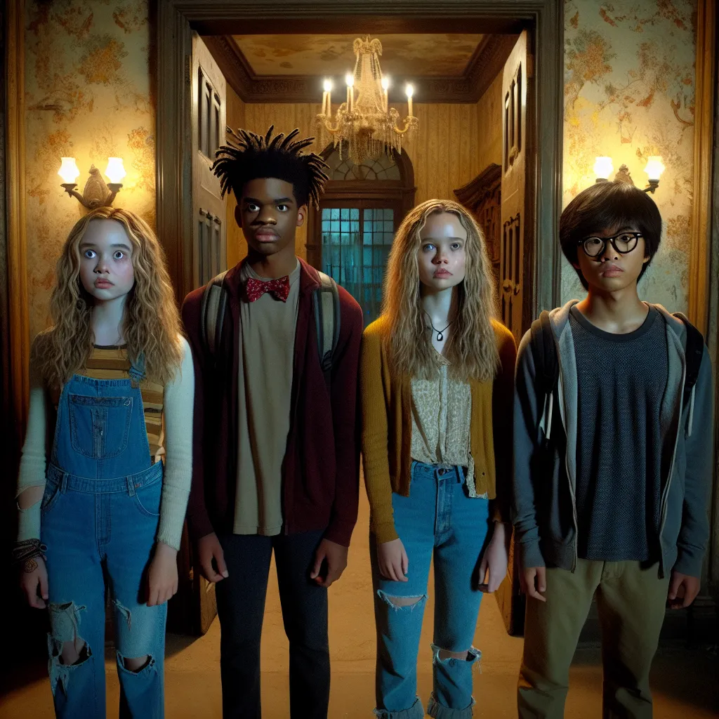 4 teenagers are standing in an abandoned mansion. There's an open door behind them.