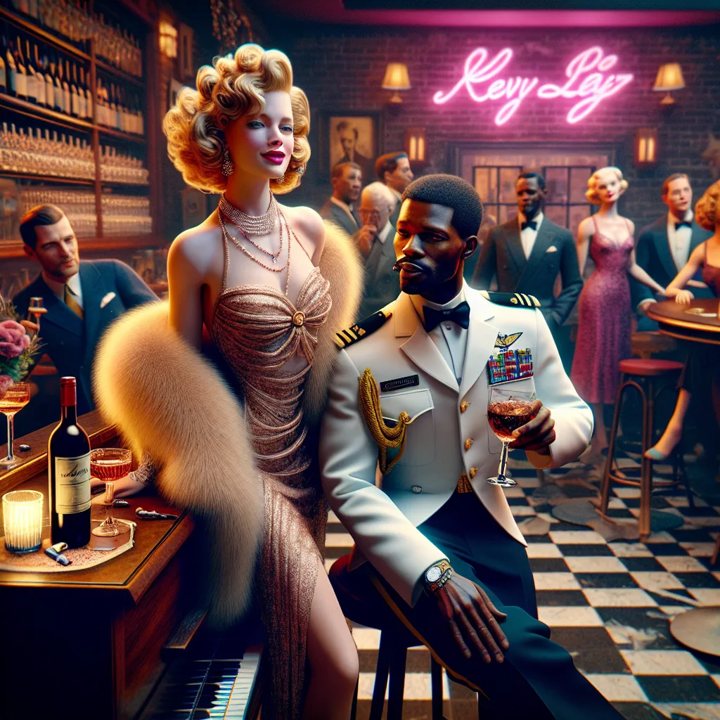 Generate an ultra-high-definition 4K HDR image with 300 DPI resolution that presents a hyper-realistic, vibrant, full-body portrait of a woman whose beauty echoes that of Sophia Loren. She's performing in a Harlem nightclub, channeling the elegance of the Harlem Renaissance with her attire—a lavish dress paired with a fur coat nonchalantly resting on the piano beside her. A bottle of fine wine and a wine glass adorn the tabletop. An American Navy officer, in his striking dress whites, stands by her side, exuding a 1920s Harlem chic in his suit, casually holding a wine glass and enjoying a cigar. The background buzzes with smartly-dressed men and women, adding depth to the scene. The room basks in a dim ambiance, softly lit by candlelight on each table, while a neon pink sign in elegant cursive proclaims "KEV's Jazz Café" on the wall, adding a warm glow to the sophisticated setting.