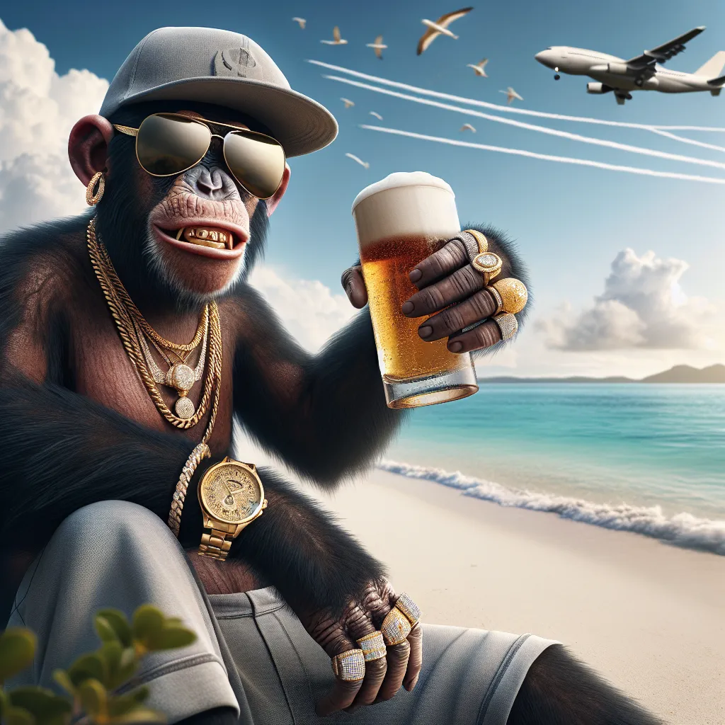🍎🍏Tatémika Prompt: Hyperrealistic image of a cheerful chimpanzee holding beer in his hand and wearing sunglasses, (cap), diamond rings and is wearing thick gold chains, he is wearing shorts. On his arm he carries a gold watch, he is sitting at the bottom of the beach. In the distance you can see a plane and birds flying closely.