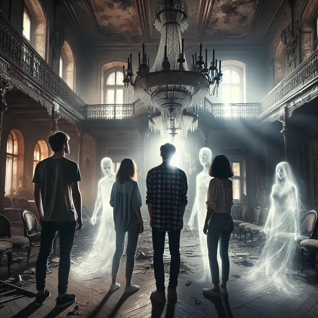 2 guys and 2 girls are standing in an abandoned mansion. They see ghosts dancing