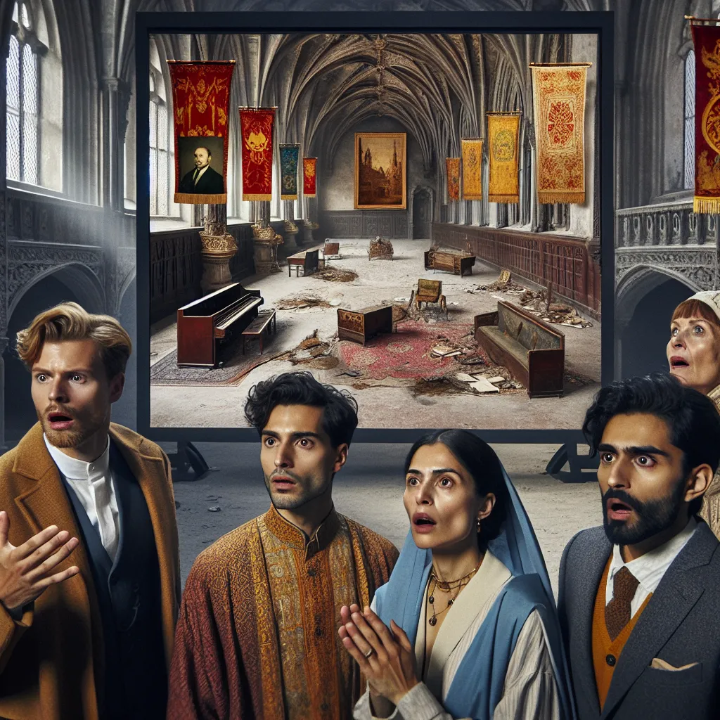 2 guys and 2 girls look at the screen in surprise. Which depicts the empty rooms of an abandoned castle
