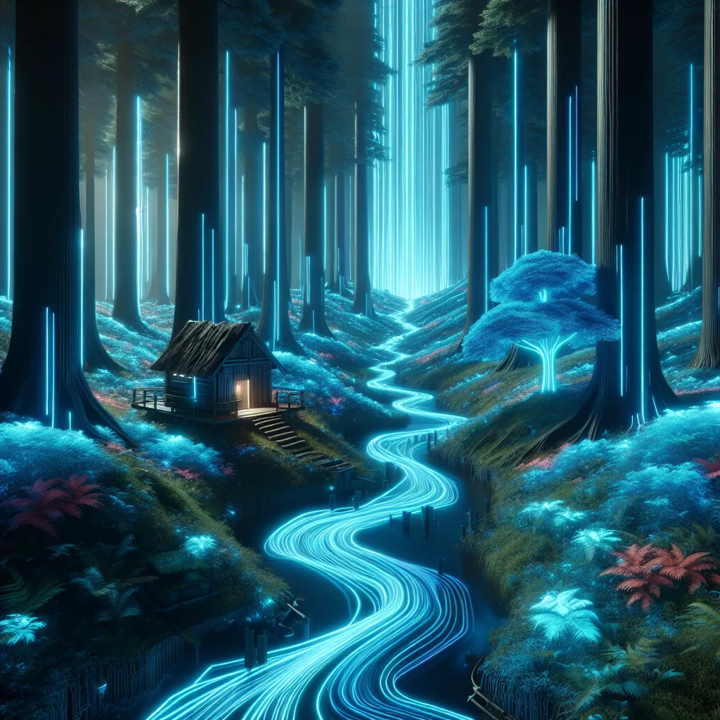 The hut stands in a forest with very tall trees. The river flows and glows with a blue light.