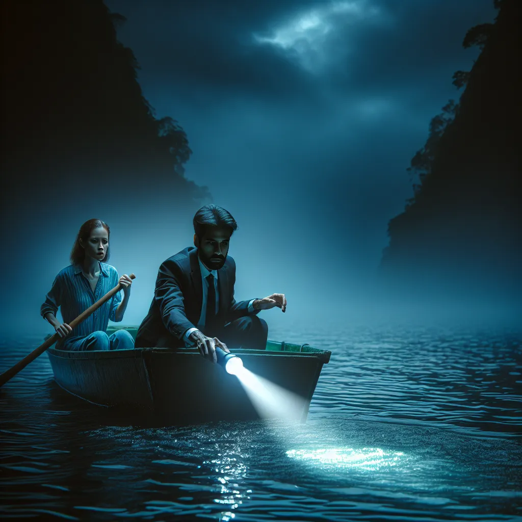 A guy and a girl are sailing on a boat in the middle of the lake. The water is dark and scary. The guy shines a flashlight into the water