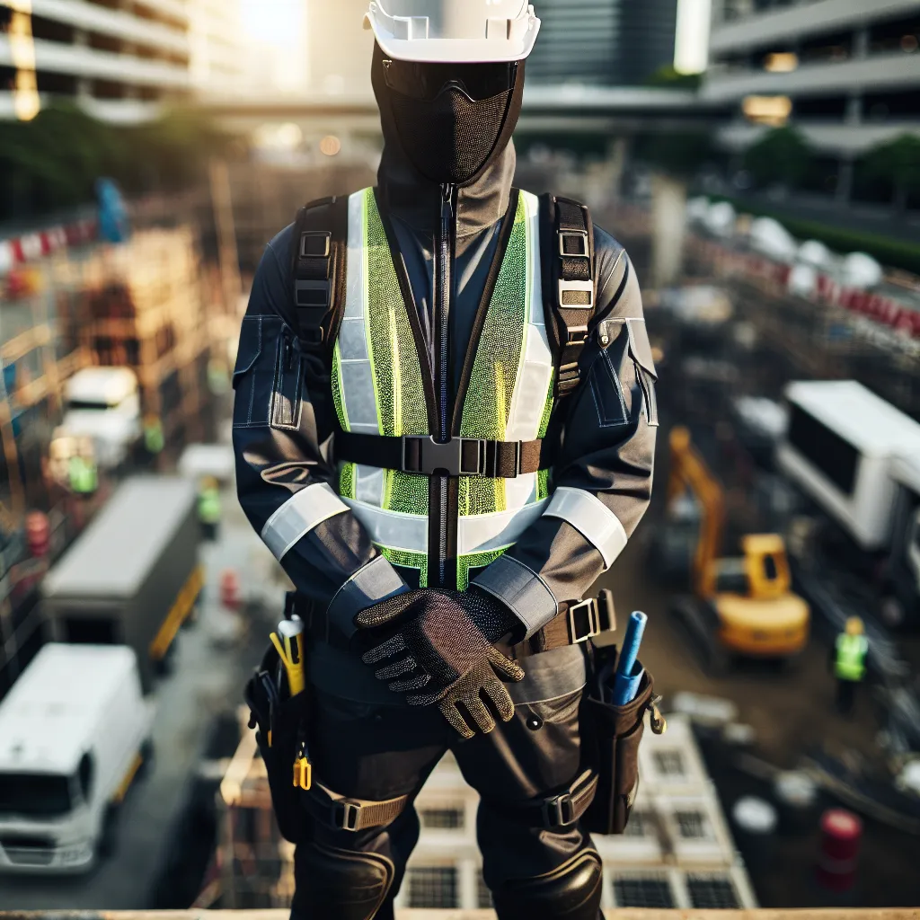 A work site featuring a Hispanic male wearing all his safety PPE. He is wearing safety glasses, white hard hat, safety vest and he is wearing black work boots and black gloves. Full body picture. Vivid clear outdoor lighting.