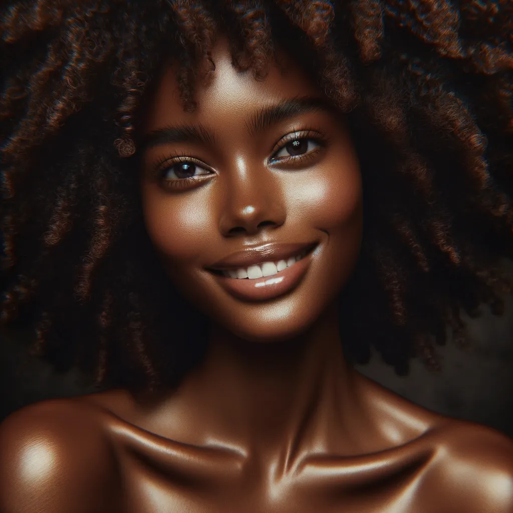 "Describe in vivid detail a radiant Afro woman whose beauty is as natural and captivating as the sun's warm embrace. Her hair is a glorious crown of tight curls that frame her face like a halo, each strand reflecting her strength and vitality. Her skin is a rich, flawless tapestry, the color of smooth, polished mahogany, that glows with an inner light. Her eyes are lively and expressive, mirrors to her serene and wise soul, that sparkle with kindness and intelligence. Her smile is broad and genuine, lighting up her features, and her laughter is a melody that echoes the joyous rhythms of her heritage. Capture her grace, her confidence, and the cultural tapestry that she embodies in her style and presence."