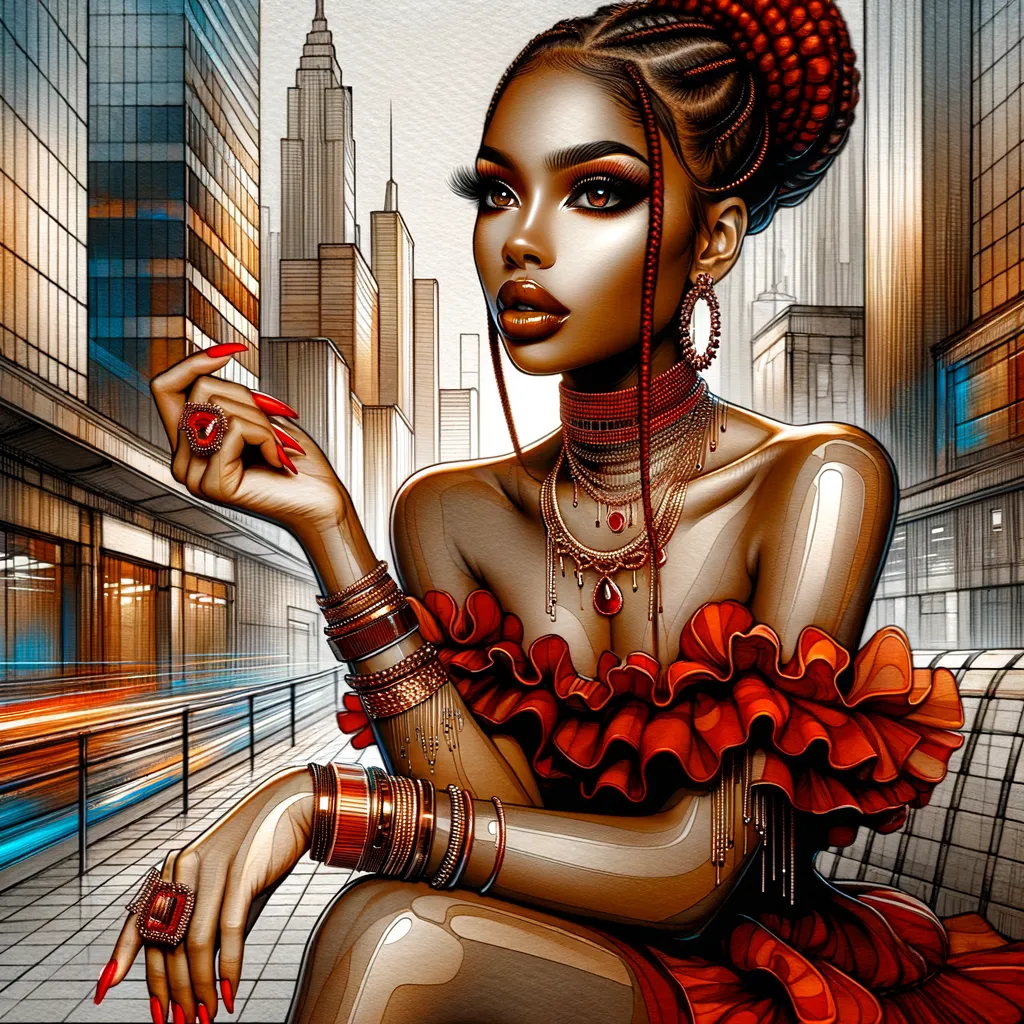 Enjoying a day out an alcohol ink of an African American slimthick toffee skin tone woman, brown siren eyes. Newyork City landscape sitting on a bench. She’s wearing a Red ruffled mini dress off the shoulders, red heels, rings, multiple necklaces, spice red low braid updo plus edges, full lips, long nails, wispy long lashes, 4K HDR contrast colors