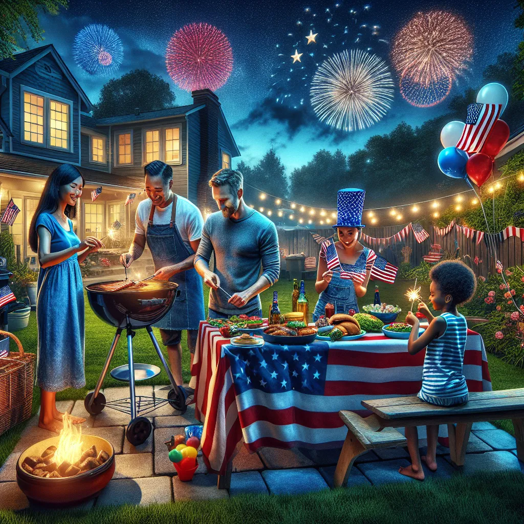 Create an ultra-detailed, ultra-realistic HDR image to celebrate the 4th of July in America. The scene should encapsulate the joyous spirit of Independence Day with fireworks, American flags, and festive decorations. A family gathered in a well-decorated backyard, enjoying a festive barbecue. Capture the details of their clothing, the food on the grill, and the joyful expressions on their faces. Ensure each element, from the sizzling burgers to the texture of the picnic tablecloth, is rendered with incredible detail.A night sky illuminated by a spectacular fireworks display. Use HDR to highlight the vivid colors, bright explosions, and dynamic light trails of the fireworks. Include the silhouette of a suburban neighborhood, with some houses decorated with American flags and lights.Incorporate small elements that signify the holiday, like sparklers in children's hands, red, white, and blue balloons, and a decorated table with traditional American foods. Use HDR to bring out the fine details and textures, making each part of the scene come alive. Technical Specifications: Use HDR to enhance the brightness and contrast, making the colors pop and the details sharp. Ensure the image maintains clarity and detail. The image should evoke the joy and communal spirit of 4th of July celebrations, reflecting American traditions and the vibrant atmosphere of the holiday.HDR, 4th of July, Celebration, Fireworks, Ultra-Detailed, Ultra-Realistic, Masterpiece,8k resolution, Family, American Flags, Festive, BBQ,