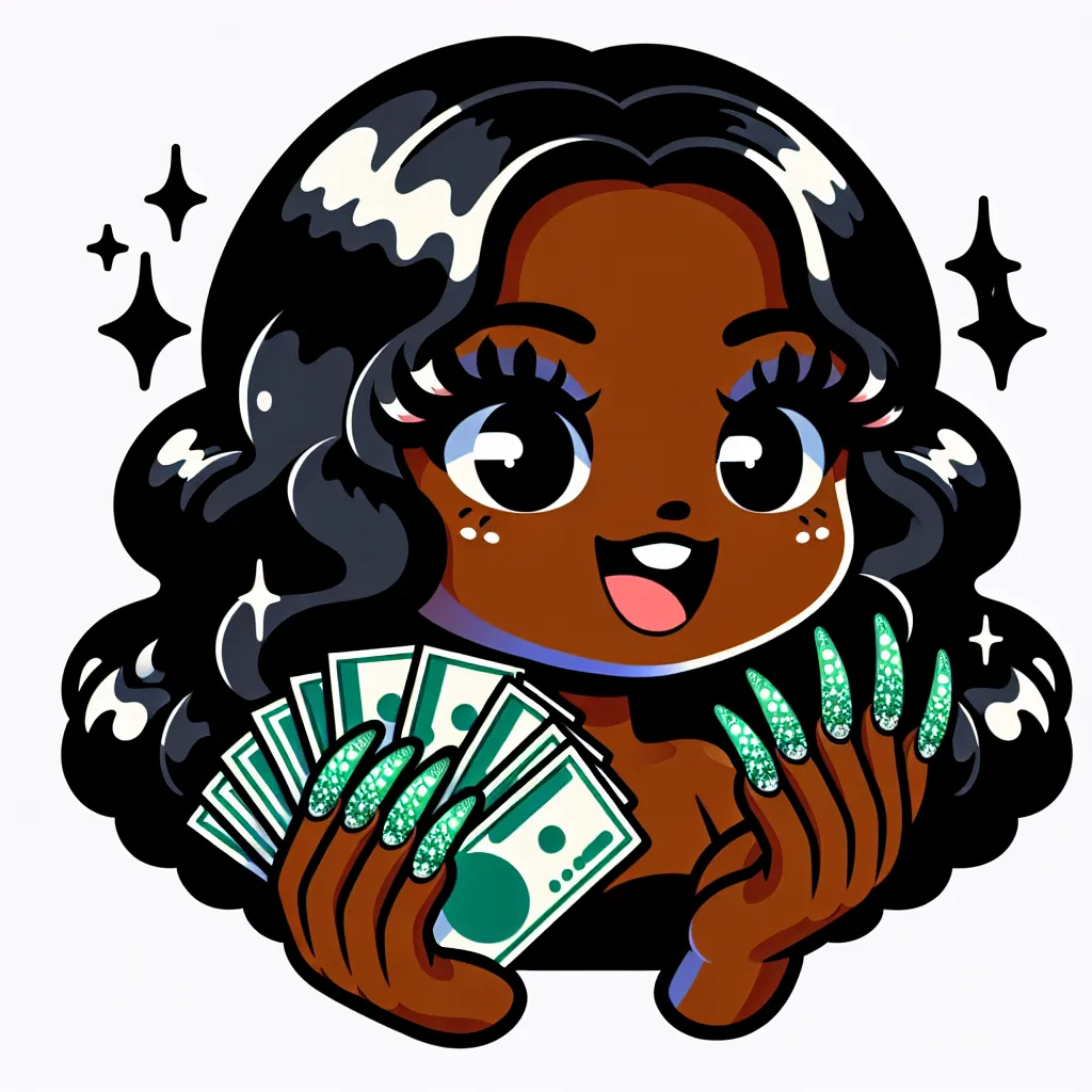 Create a high-resolution cartoon depiction of an African American woman with brown eyes and deep wavy hair. Show her hands, which have long, elaborately decorated nails holding a stack of hundred-dollar bills. The nails should be painted in a gradient glow of dark green with intricate designs, including rhinestones and glitter. Additionally, the hand should be adorned with multiple diamond rings to emphasize luxury and glamour. The background should consist of a gradient from white to light grey, with no deformities present.