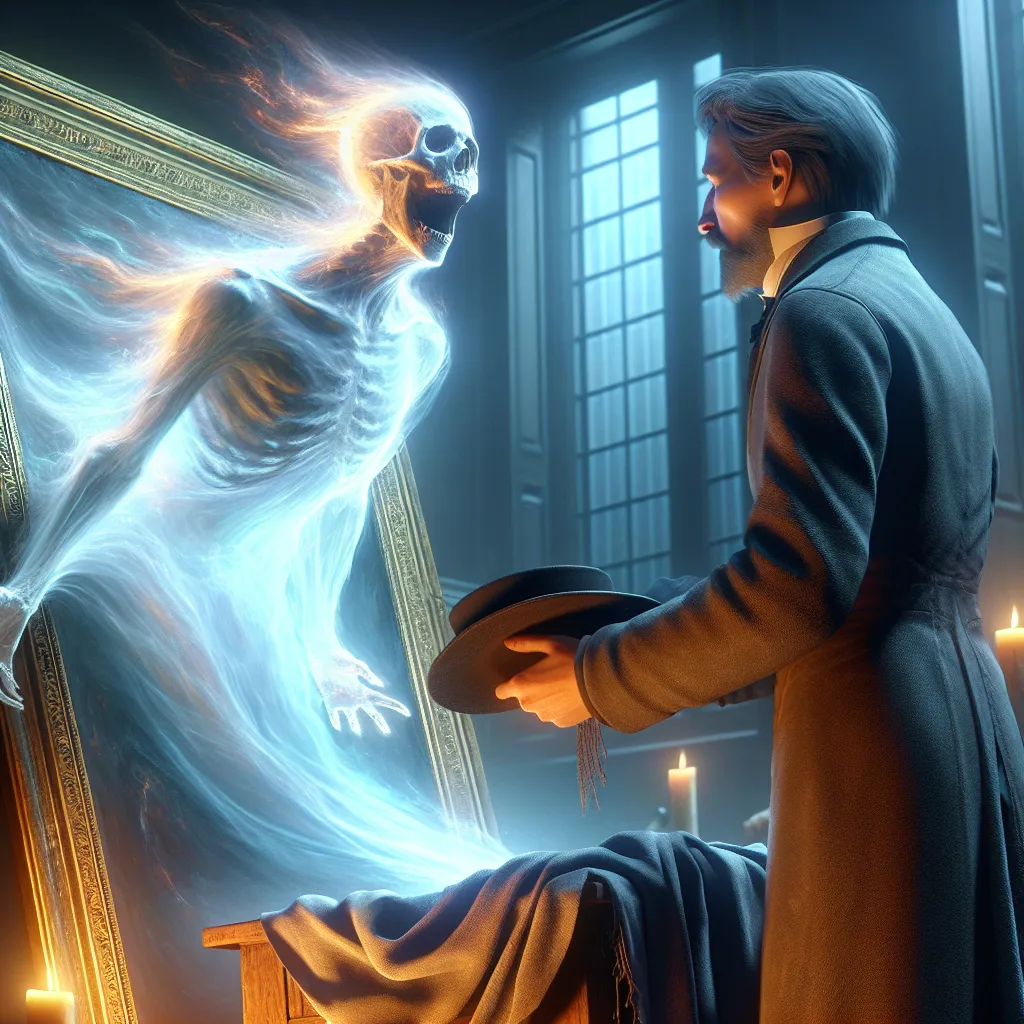 As an unsuspecting man looks beneath a cloth, draped over the cursed portrait, his soul is sucked into the portrait trapping his soul within the canvas. 8k resolution, HDR, masterpiece, ultra-detailed, ultra-realistic, 3D, showcasing the action of his soul being sucked into the portrait