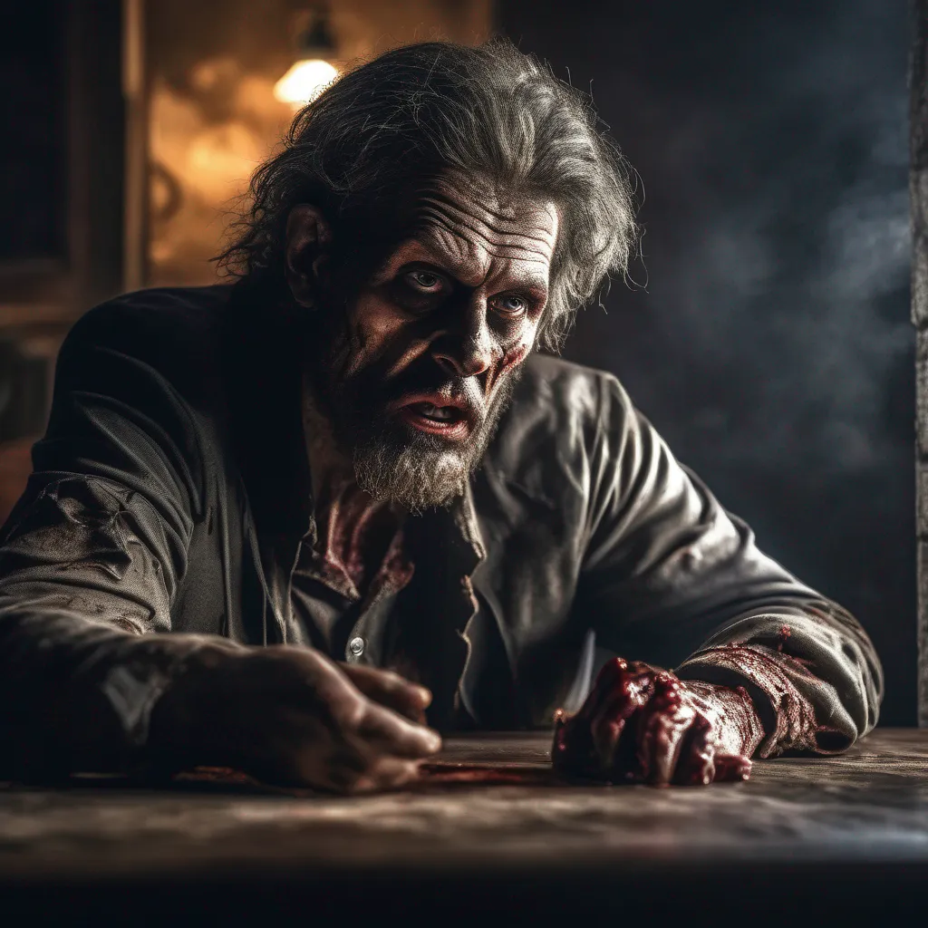 A zombie looking for his brain, egxrated confused look on zombie face, 8k resolution, HDR, ultra-detailed ultra-realistic 3D, image should depict saddens and sorrow of missing someone, perfect composition and lighting, the Brain is on the table