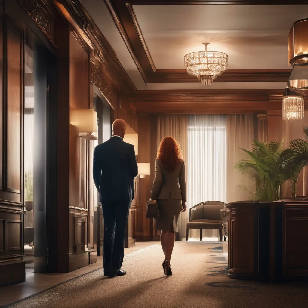 A photorealistic image. A long ginger haired female checking into her hotel during a heat wave. A tall, bald, masculine, tan man in a business suit is expecting her and waiting in the room.