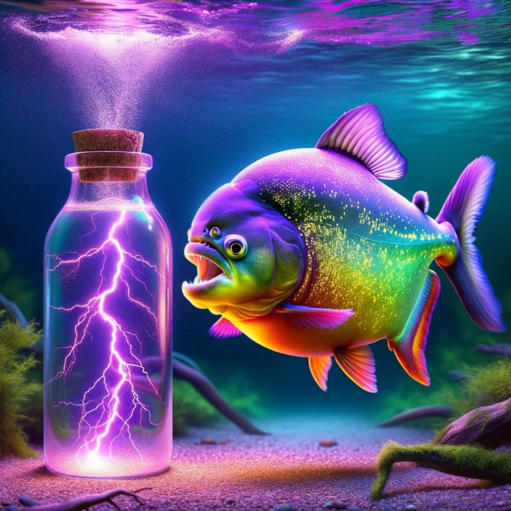 Purple and lime green piranha not showing his teeth catching lightning in a bottle