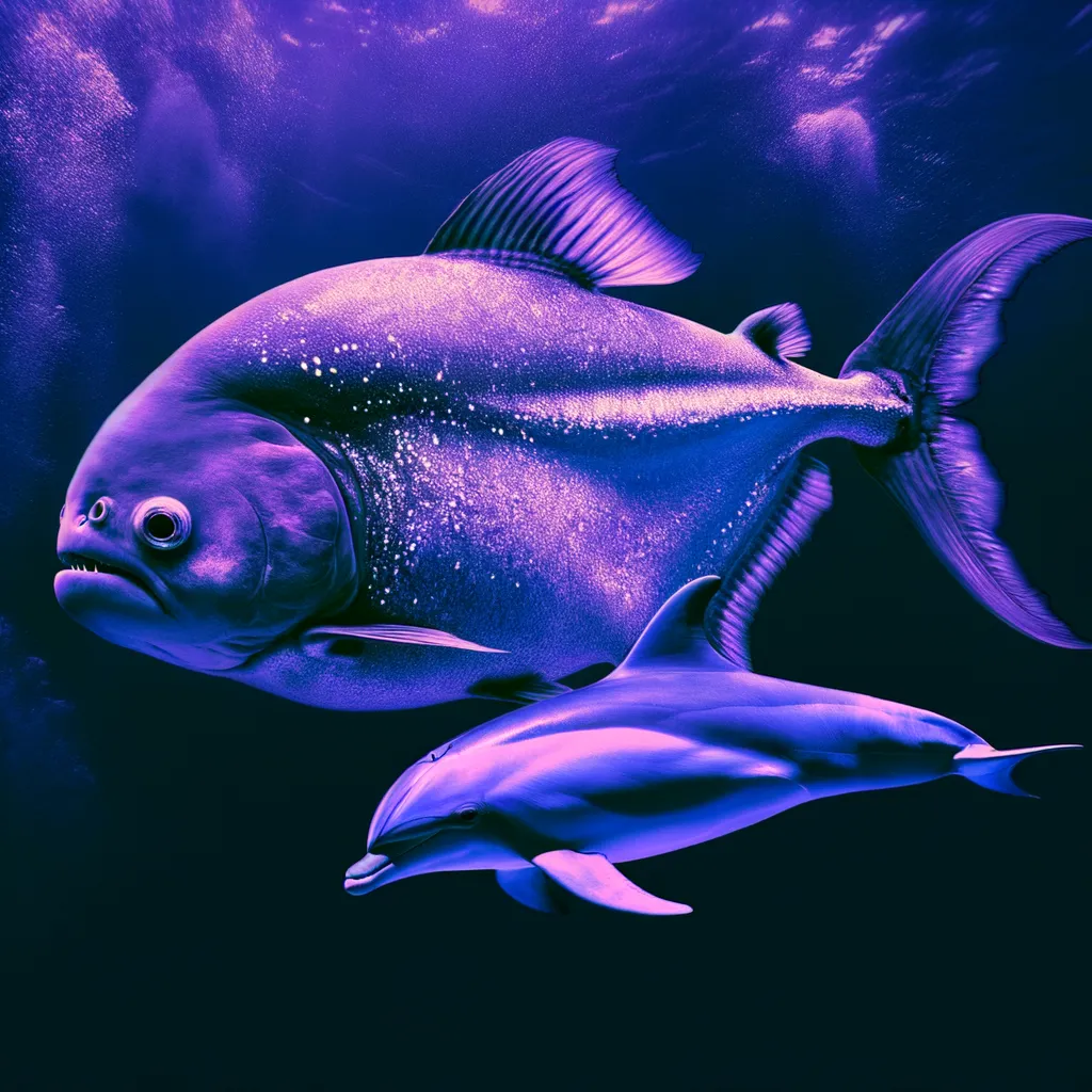 Purple piranha not showing his teeth swimming with a blue dolphin