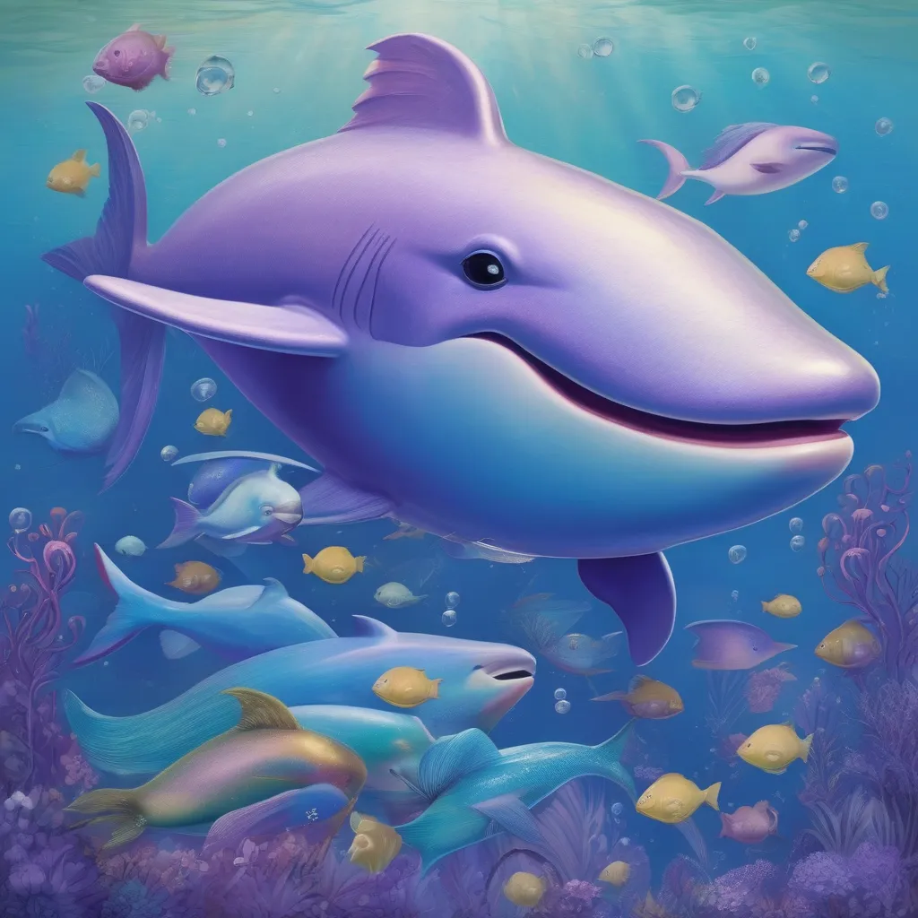 Purple piranha not showing his teeth swimming with a blue dolphin