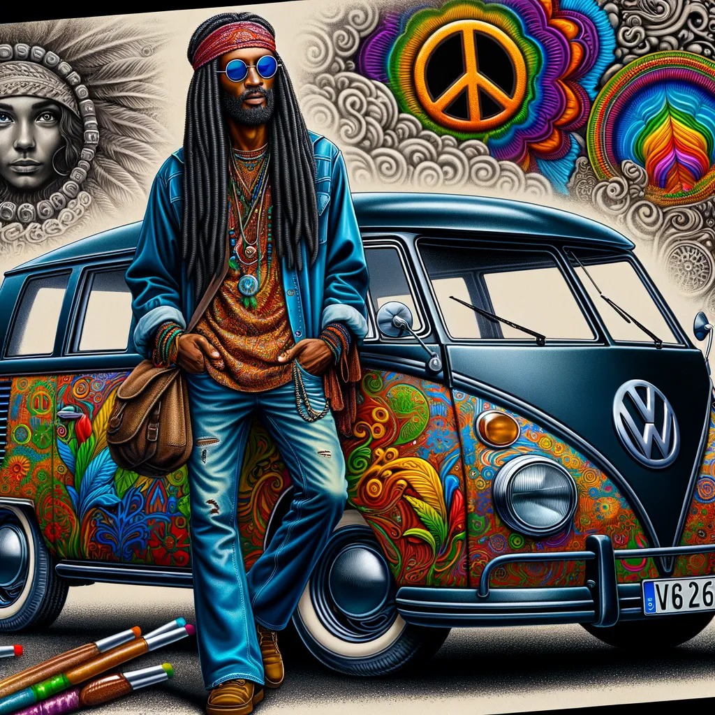 airbrush style: Volkswagen landscape create a realistic image of a hippie black man with dreads image of a hippie black man with dreads contrast colors vivid colors intricate details 64k HDR hippie background